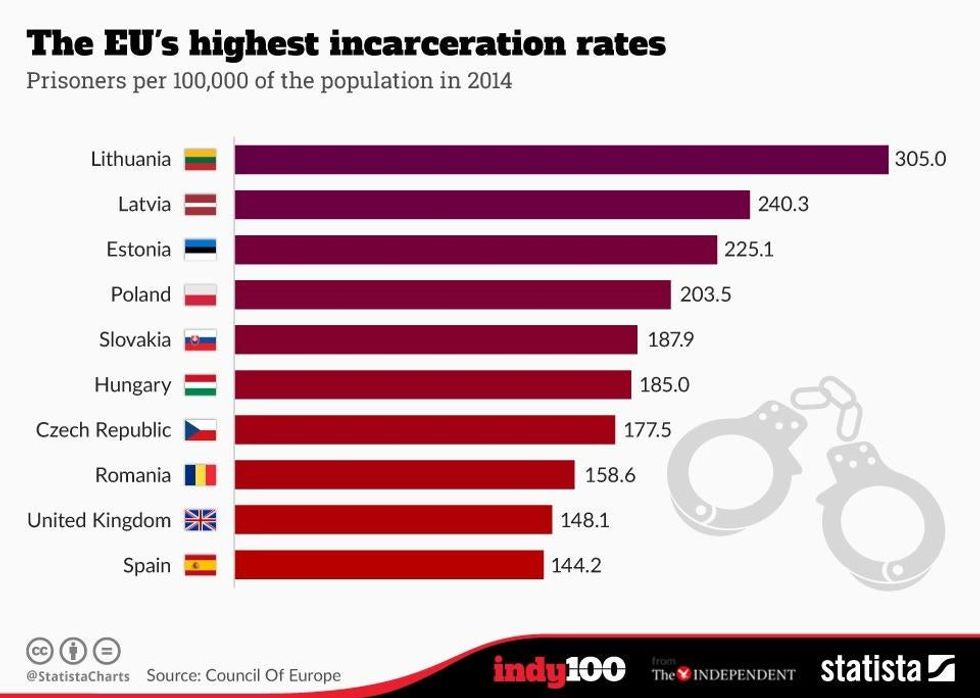 The incarceration rate per 100,000 population is also higher in the UK (148.1) than in Germany (81.4) and France (118), as the below chart by Statista demonstrates:
