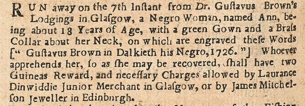 Run away on the 7th instant from Dr Gustavus Brown's Lodgings in Glasgow, a Negro Woman, named Ann, being about 18 Years of Age, with a green Gown and a Brass Collar about her Neck, on which are engraved these words ["Gustavus Brown in Dalkieth his Negro, 1726."] Whoever apprehends her, so as she may be recovered, shall have two Guineas Reward, and necessary Charges allowed by Laurence Dinwiddie Junior Merchant in Glasgow, or by James Mitchelson Jeweller in Edinburgh.