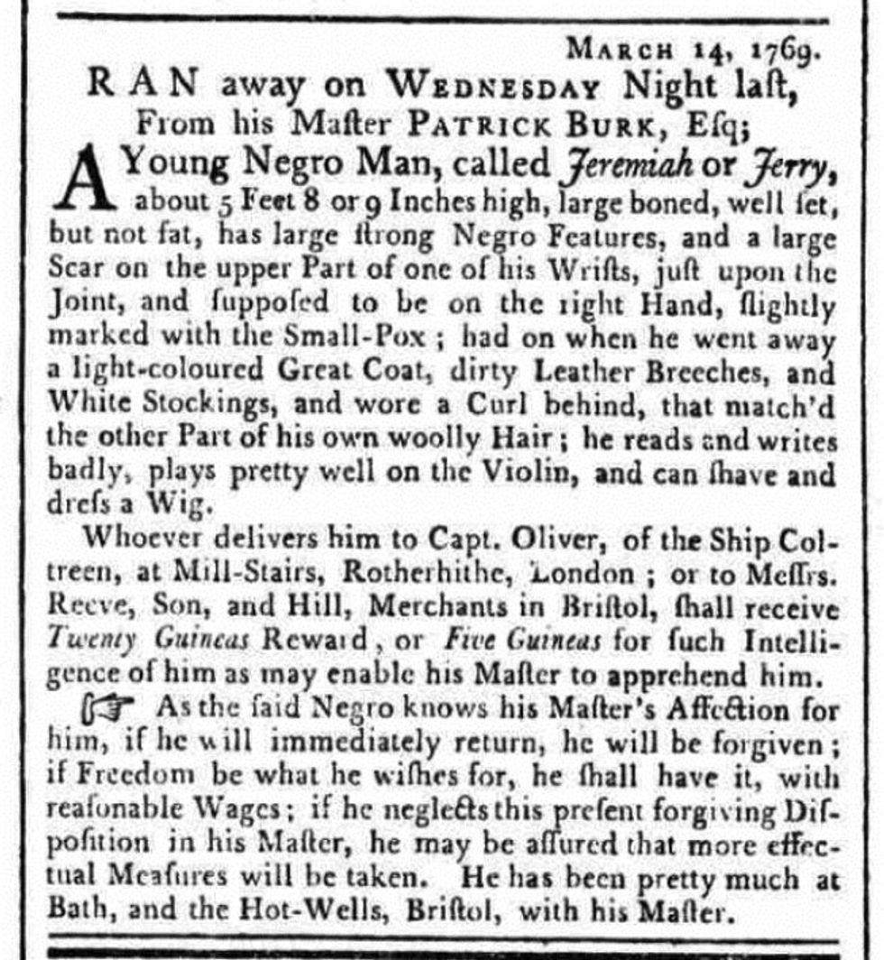 A Young Negro Man, called Jeremiah or Jerry, about 5 Feet 8 or 9 Inches high, large boned, well set, but not fat, has large strong Negro Features, and a large Scar on the upper Part of one of his Wrists, just upon the Joint, and supposed to be on the right Hand, slightly marked with the Small-Pox; had on when he went away a light-coloured Great Coat, dirty Leather Breeches, and White Stockings, and wore a Curl behind, that match'd the other Part of his own woolly Hair; he reads and writes badly, plays pretty well on the Violin, and can shave and dress a Wig.