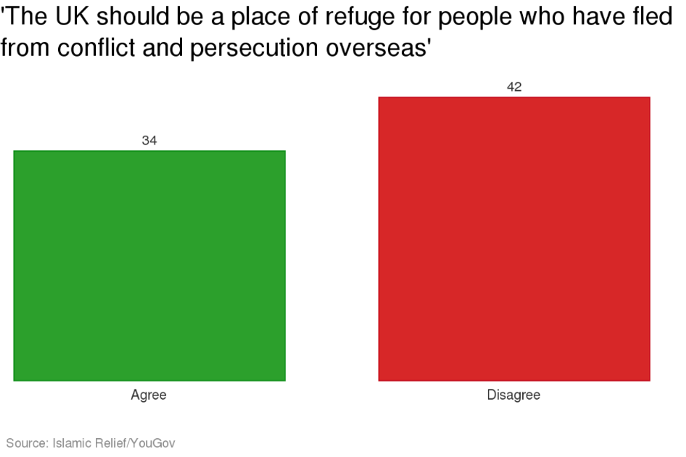 In what the charity Islamic Relief said was a “dramatic hardening of views” against people displaced by war, a poll by YouGov showed that 42 per cent of Britons do not think foreign nationals seeking safety from conflict or persecution should be welcomed to the UK.
