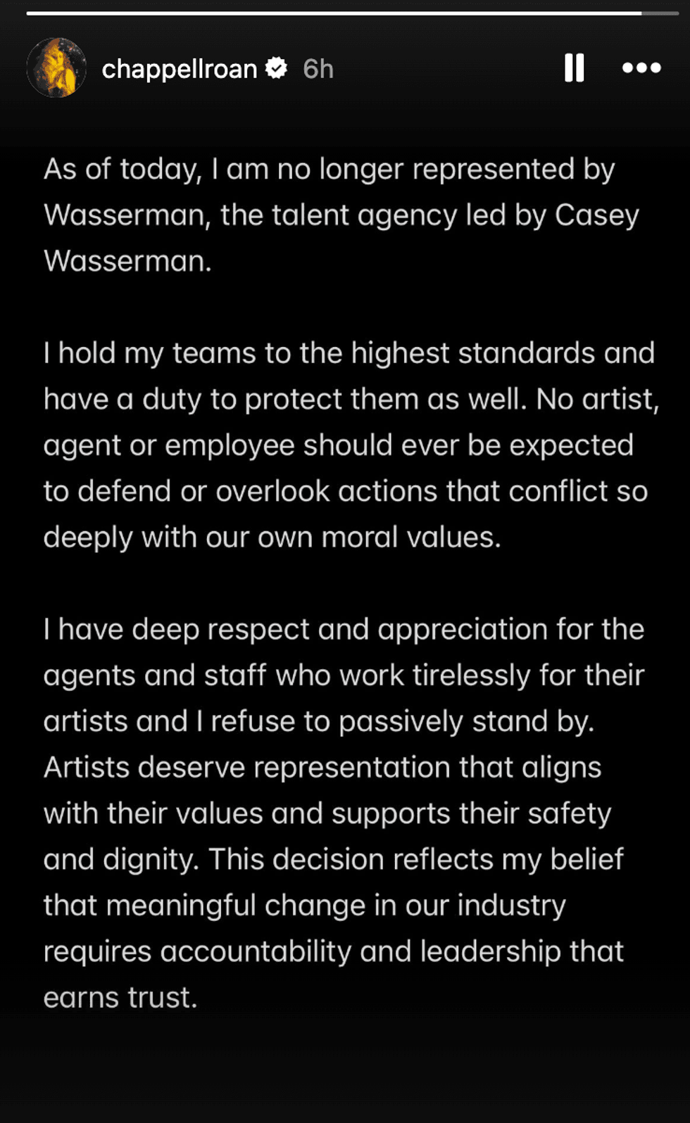While she did not mention Jeffrey Epstein or the files, Roan stated: "I hold my teams to the highest standards and have a duty to protect them as well. No artist, agent or employee should ever be expected to defend or overlook actions that conflict so deeply with our own moral values.