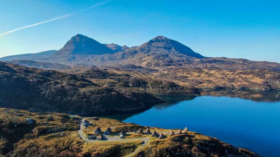 The lodges overlook Loch a’ Chairn Bhain and towards the three-peaked mountain Quinag, which the charity cares for.