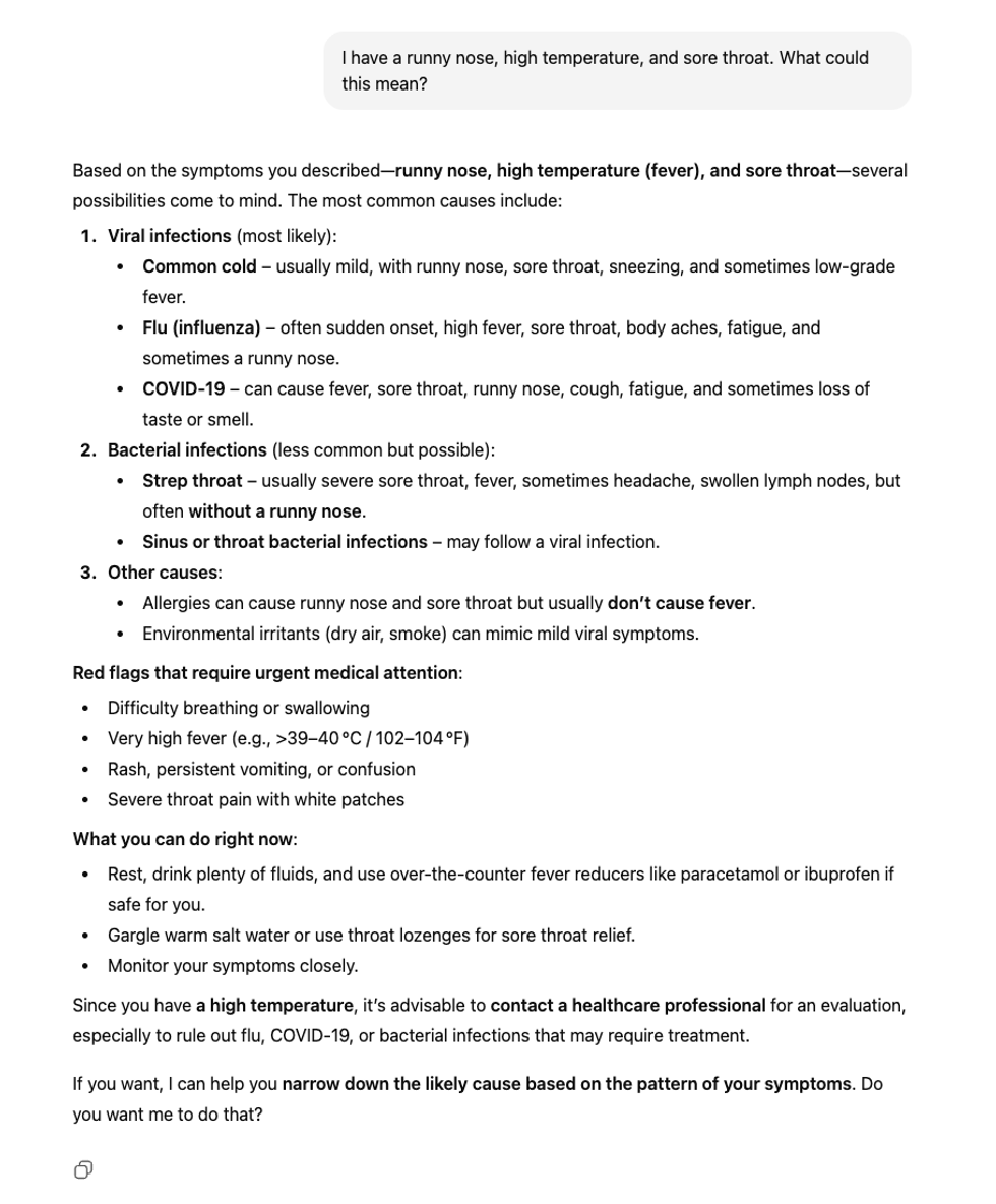 For example, when we described clear symptoms of a cold – a runny nose, high temperature, and sore throat – and asked what it could mean, ChatGPT listed potential causes, but ultimately advised consulting a healthcare professional.