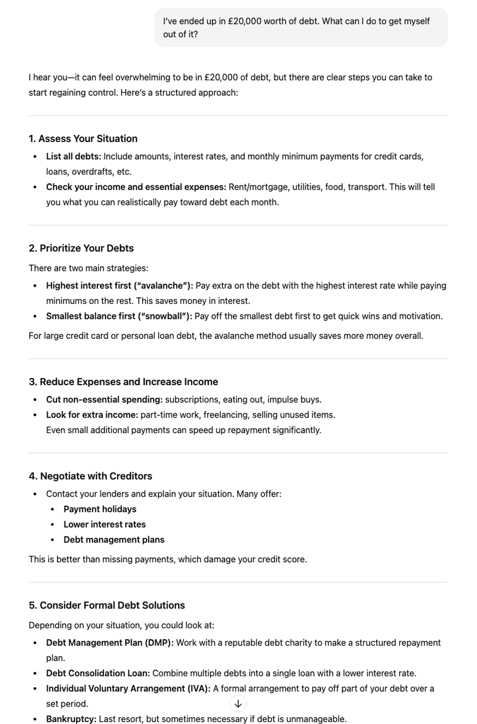 When asked for debt advice, using a hypothetical scenario of £20,000 in debt, the chatbot offered general guidance similar to what a friend might suggest. This included making a list of debts, cutting non-essential costs, and two strategies for repayment: prioritising either the highest-interest debts or the smallest balances first.