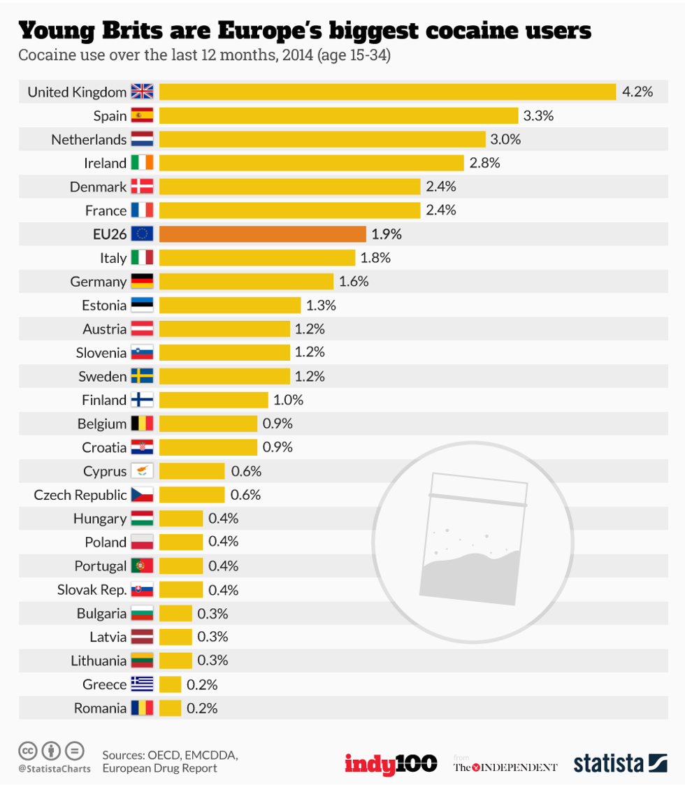 The below chart by Statista shows that the UK topped Europe for cocaine use among young people, well above the European average of 1.9 per cent prevalence: