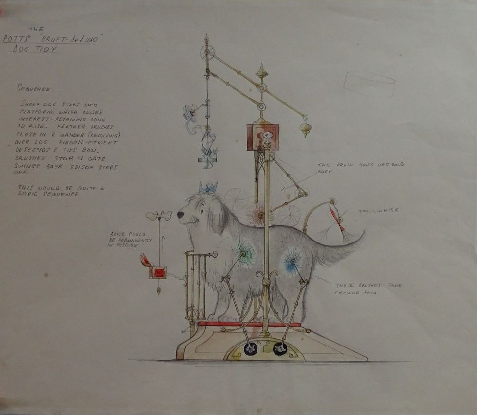 Emmett’s work includes an illustration for “The Potts Cruft-de-Luxe Dog Tidy” which features in the film and carries Emett’s annotations explaining how each part of the invention works.