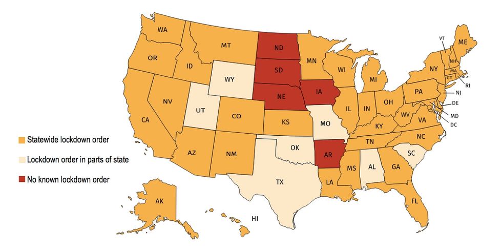 The New York Times reports that, as of 2 April, a small group of states – Arkansas, Iowa, Nebraska, North Dakota, and South Dakota – had no known lockdown orders in place. All of these states have Republican governors.