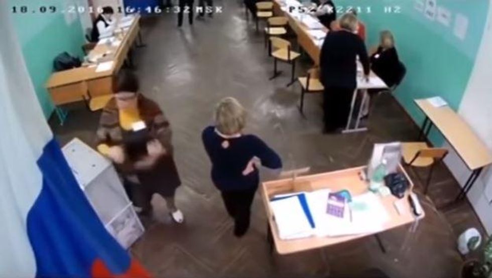 As Channel 4 and many YouTube commenters pointed out the footage is actually from Russian elections - as many stills show the flag of the Russian Federation and crests on ballot boxes.