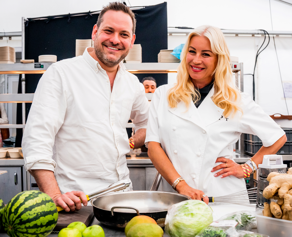Following her earlier set, Van Outen swapped her decks for dishes to help create the gourmet selection of Ross’s favourites.