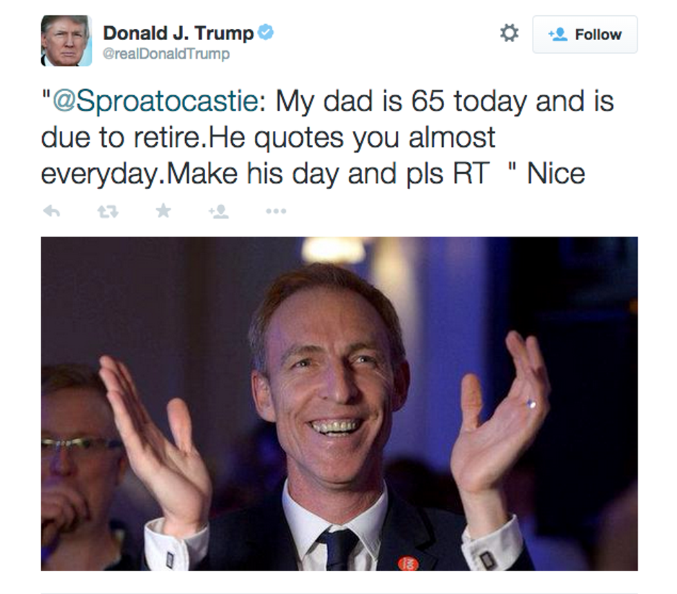 Donald Trump, who loves a manual retweet, has a tendency to be tricked into reposting bogus messages. This weekend it was the turn of Twitter user Sproatocastie who sent this message featuring Scottish Labour leader Jim Murphy (real age 47).