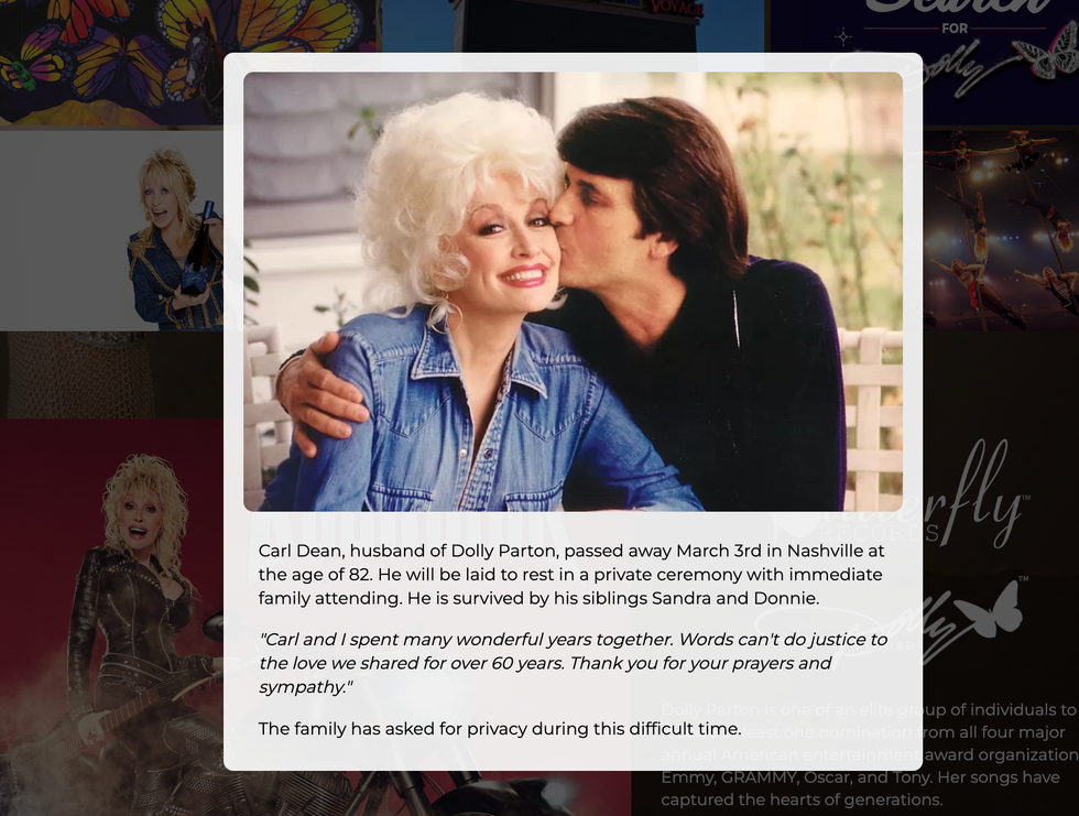 A statement shared on her official website reads: "Carl Dean, husband of Dolly Parton, passed away March 3rd in Nashville at the age of 82. He will be laid to rest in a private ceremony with immediate family attending. He is survived by his siblings Sandra and Donnie."