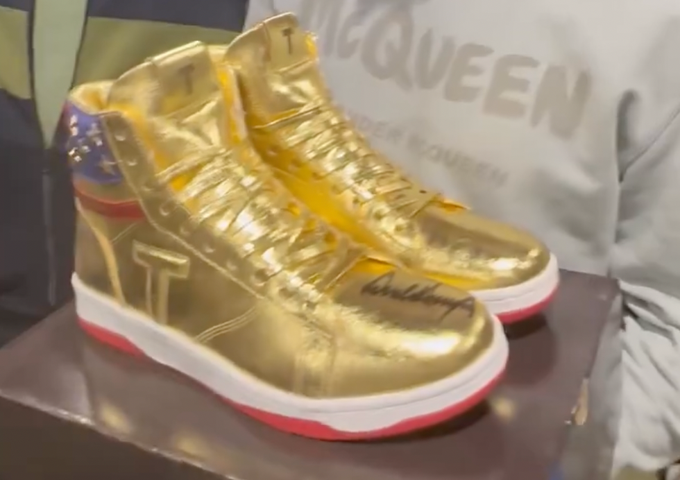 The former US president attended the event on Saturday (17 February) to introduce his new line of footwear. The gold high tops feature an American flag on the back and a "T" embossed at the front.