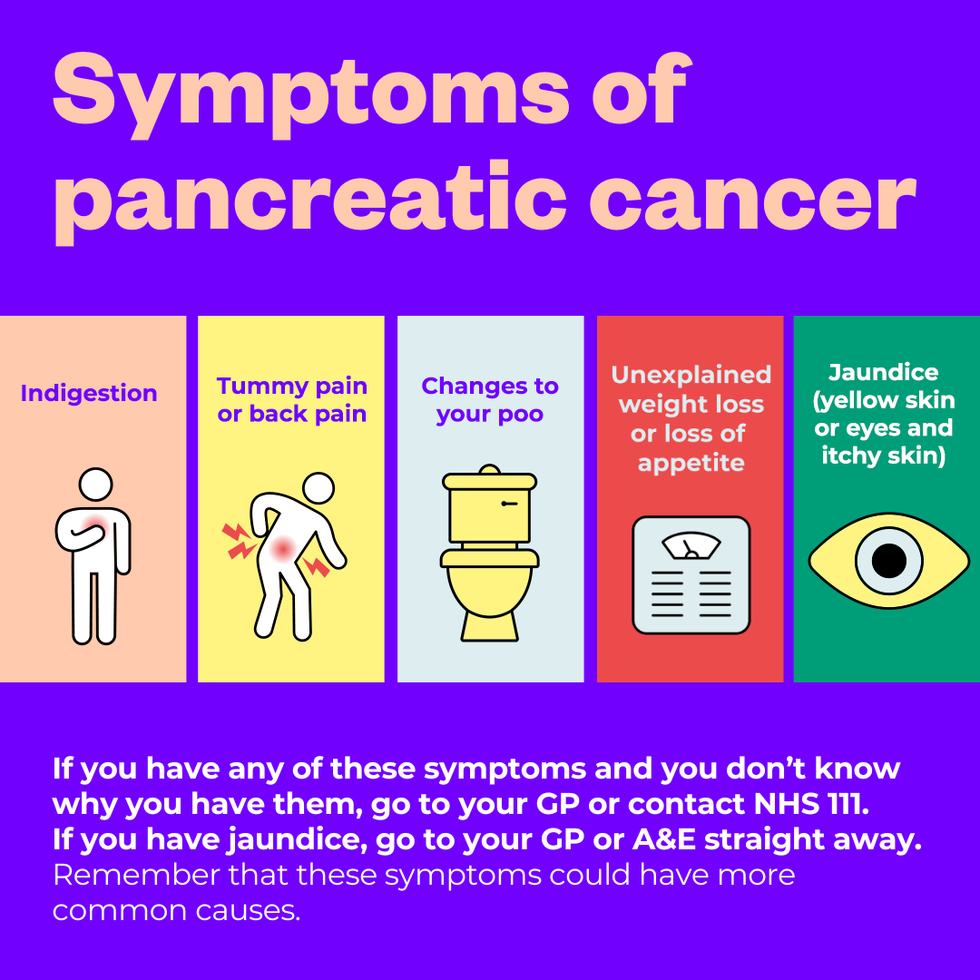 Pancreatic Cancer UK recommends that anyone experiencing one or more of the most common symptoms – back pain, indigestion, tummy pain and weight-loss – for more than four weeks should contact their GP.
