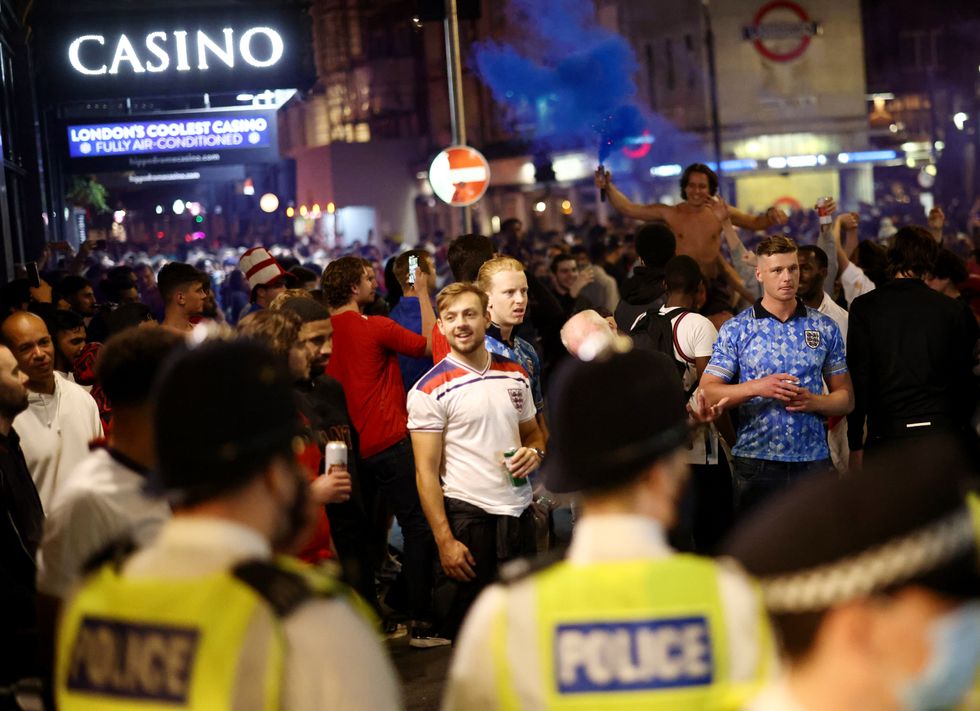 England fans clashed with police in London. According to The Mirror, a line of police officers tried to disperse fans from Leicester Square while one supporter was seen letting off a flare in Piccadilly Circus.