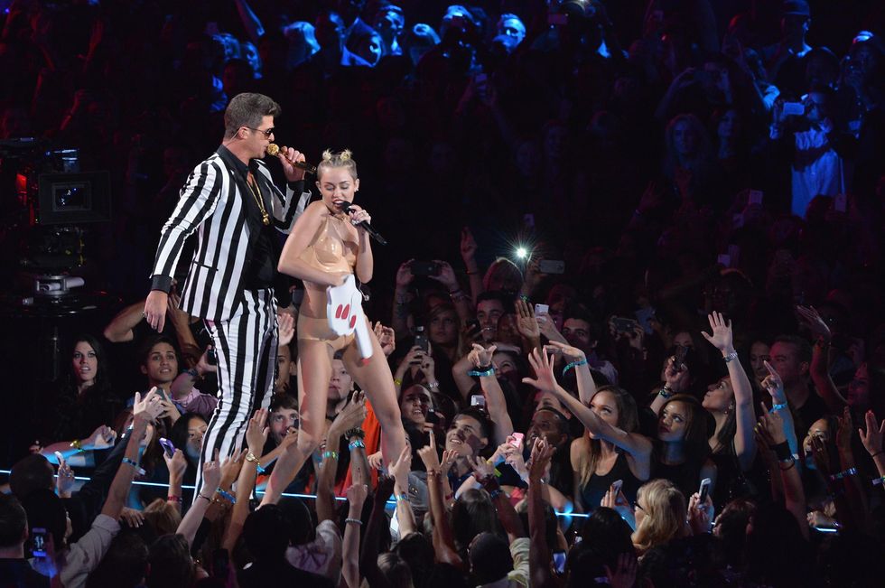 The then-20-year-old twerked as she sang her hit song We Can’t Stop in a silver swimming costume and then changed into a nude latex two-piece and was holding a foam finger as she sang with Robin Thicke his 2013 hit Blurred Lines.