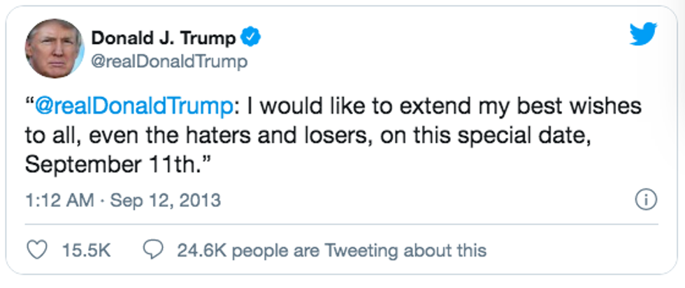 In 2013, Trump sent out his "best wishes to all", including his "haters and losers", on September 11th.