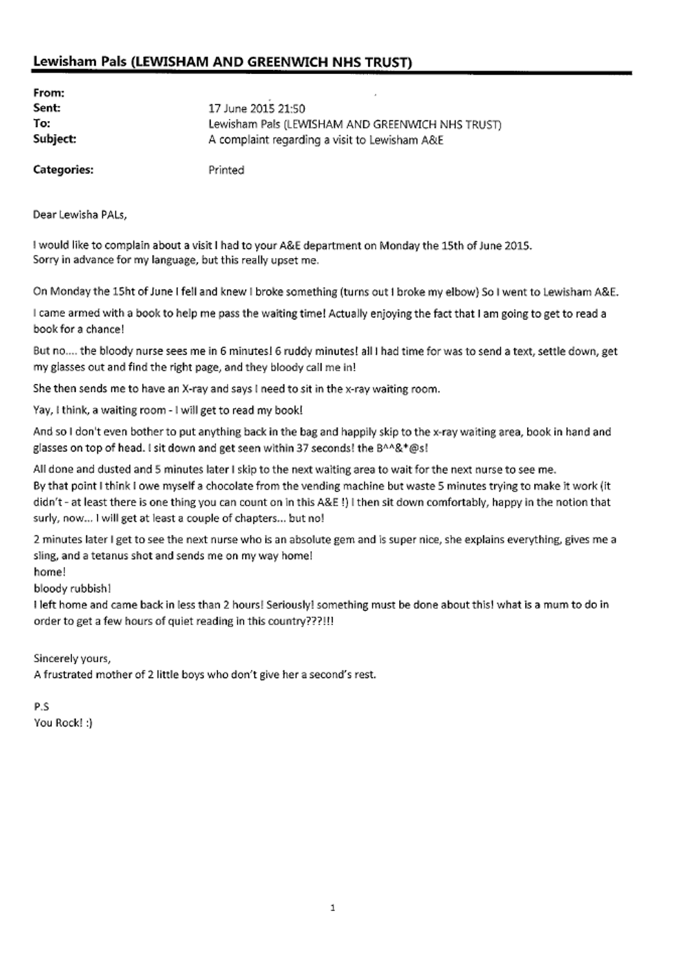 But the mother-of-two, an animator from south-east-London, was so disappointed with aspects of the care she received that she wrote to Lewisham and Greenwich NHS Trust's patient advice and liaison service.