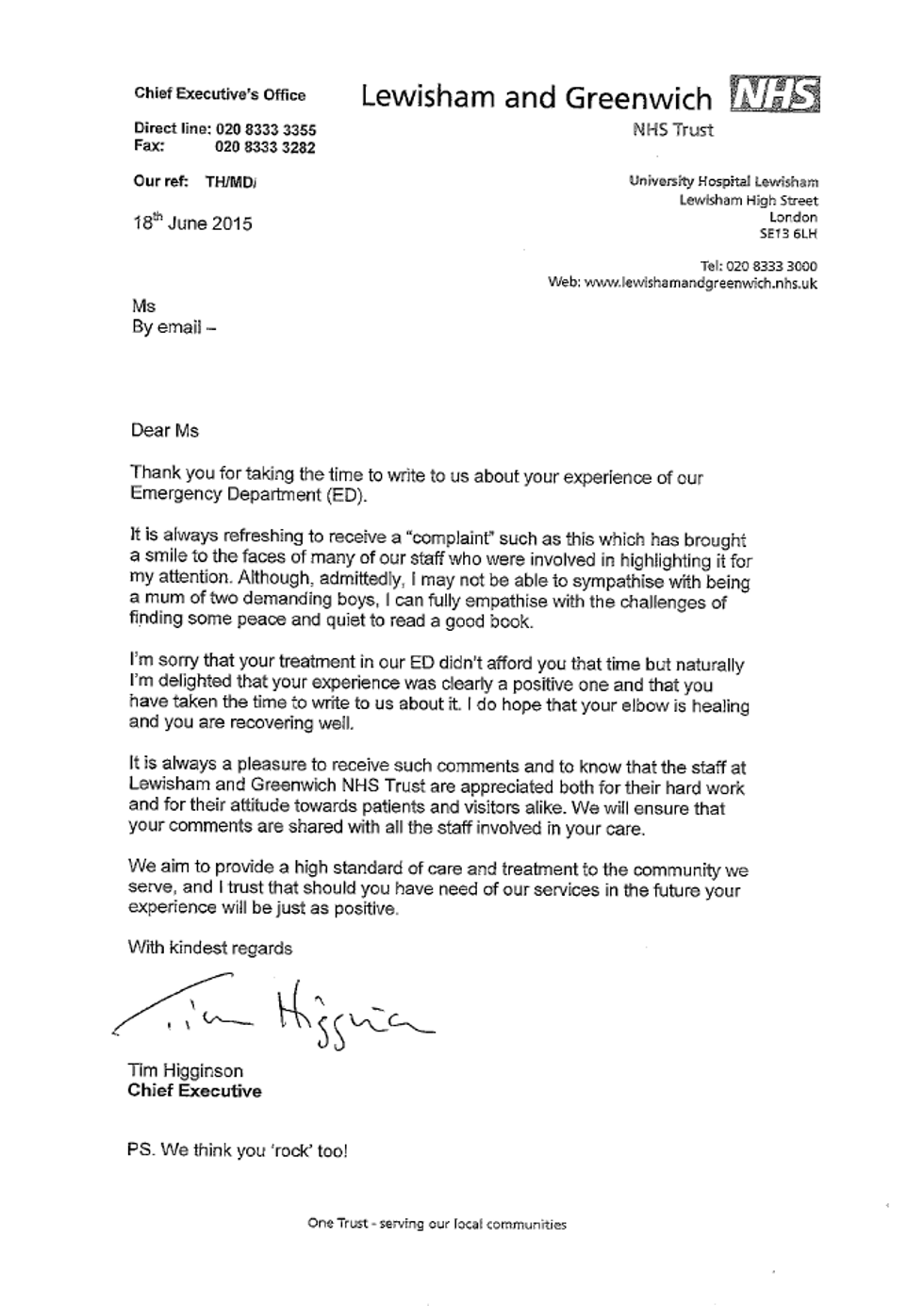 "I'm sorry that your treatment in our [emergency department] didn't afford you that time but naturally I'm delighted that your experience was clearly a positive one and that you have taken the time to write to us about it. I do hope that your elbow is healing and you are recovering well."