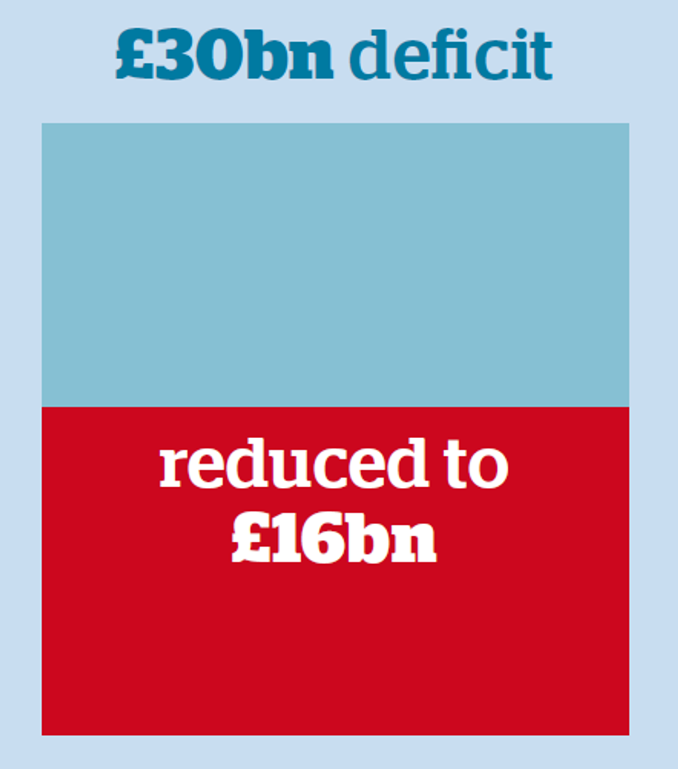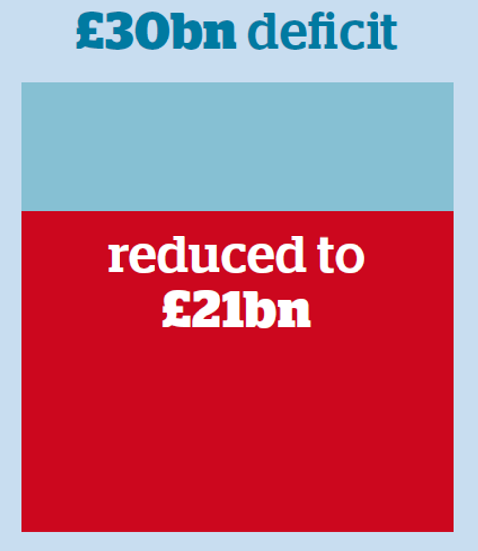 The NHS budget remains flat in real terms over the period, but it delivers stronger efficiency savings of 1.5 per cent. Combined effect is that the £30bn deficit is cut by half, to about £16bn.