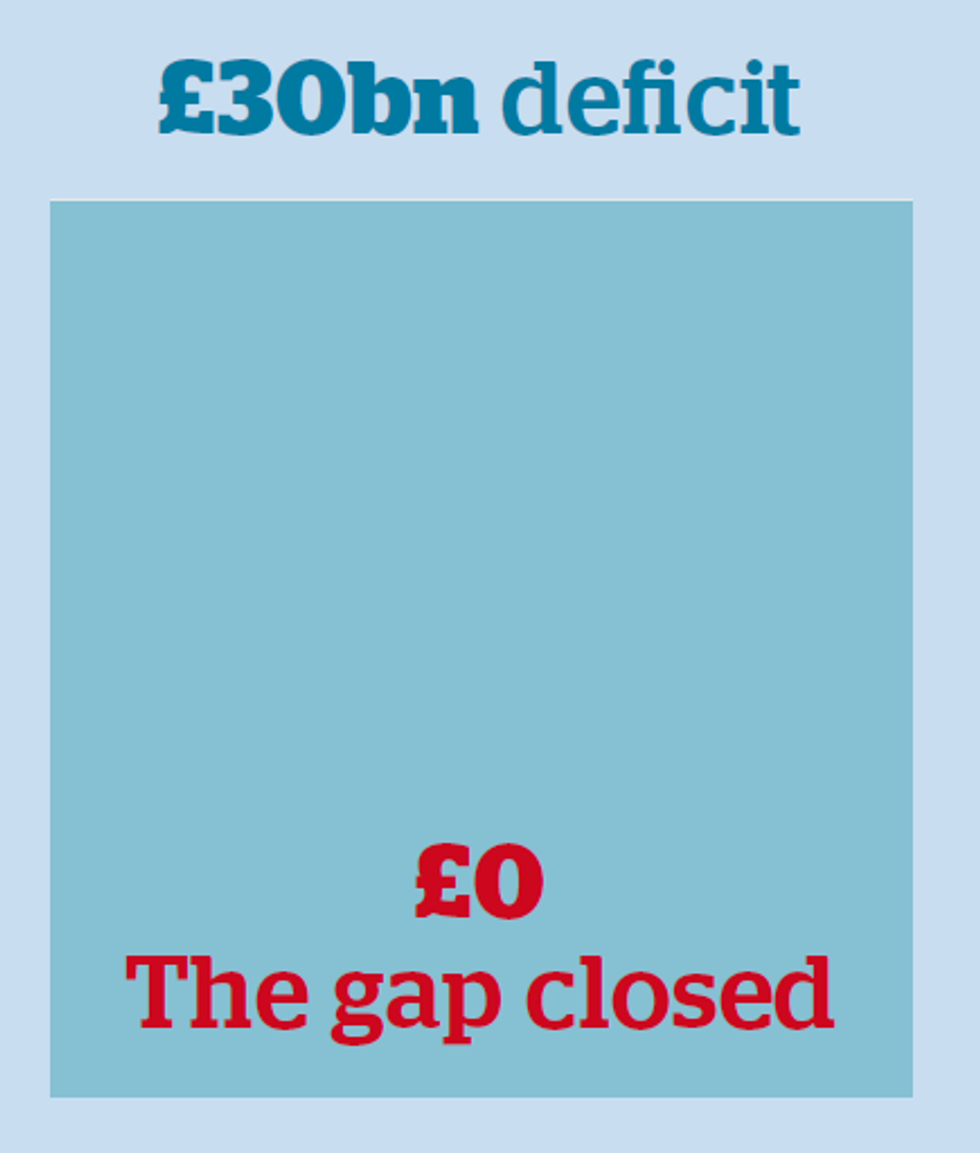 The NHS budget remains flat in real terms from 2015-16 to 2020-21. The NHS delivers its long-run productivity gain of 0.8 per cent a year. The combined effect is that the £30bn deficit is cut by about a third, to £21bn.