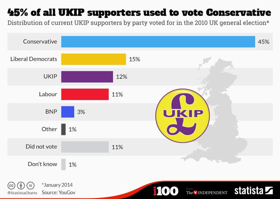 This chart from Statista shows that Ukip has mainly drawn its support from disenchanted Tory voters, but also the Lib Dems and Labour.