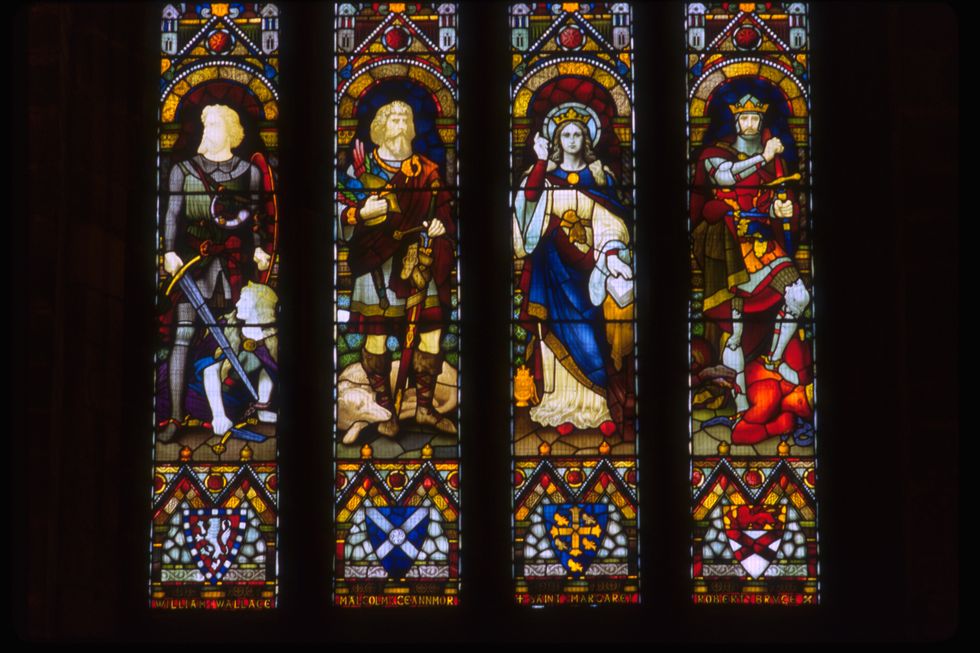 It includes King Malcolm III and his wife Margaret in reference to the founding of the Abbey, while the figures of William Wallace and Robert the Bruce evoke Scotland’s fight for independence.