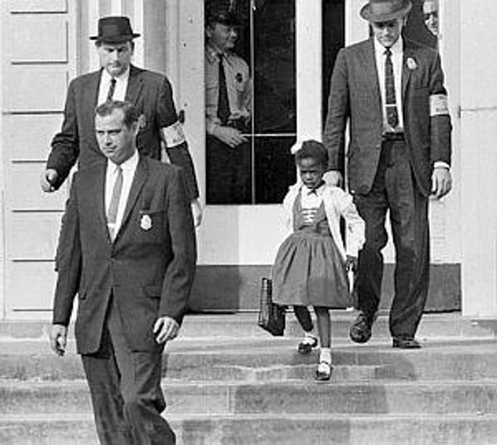 Ruby Bridges is shown here with her escort at William Frantz Elementary School in New Orleans, 1960.