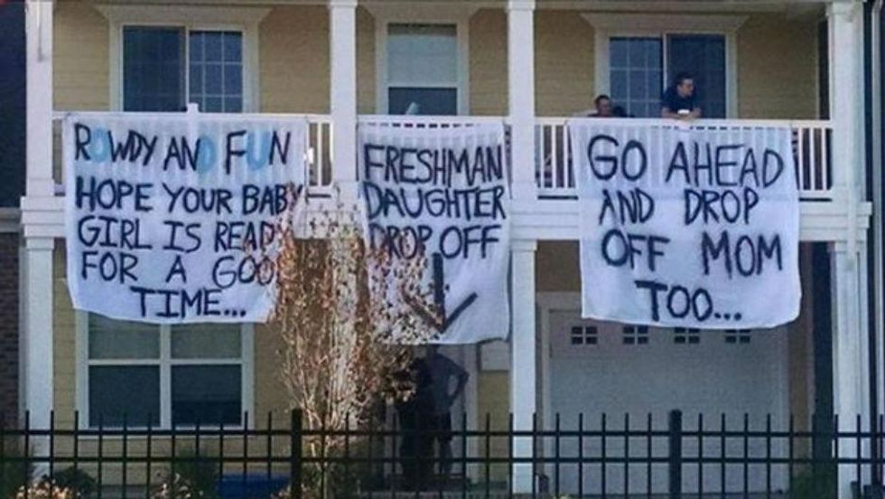 "Hope your baby girl is ready for a good time," one read, while another read "freshman daughter drop off" with an arrow pointing to the fraternity house front door and a third boasting "go ahead and drop off mom too".