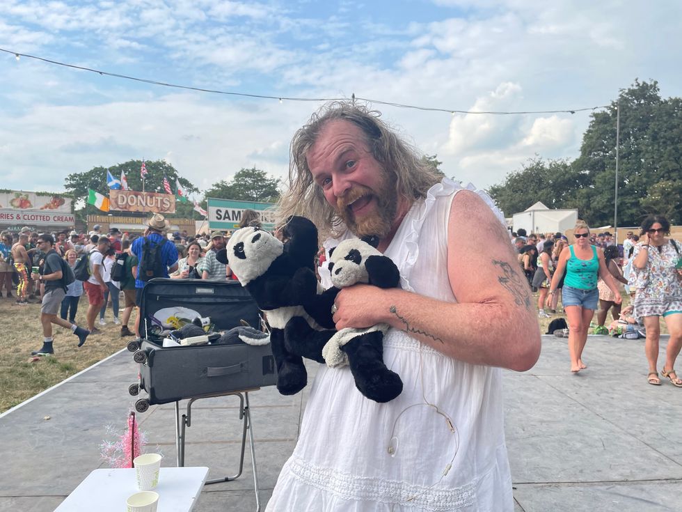 Dancing around a stage in a short white dress, the 48-year-old from Newtonabbey in Belfast had hundreds of onlookers singing along to famous songs reimagined to reference his two panda hand puppets – including the lyrics “Woah Black Betty, panda hands” to the tune of Ram Jam’s 1977 hit.
