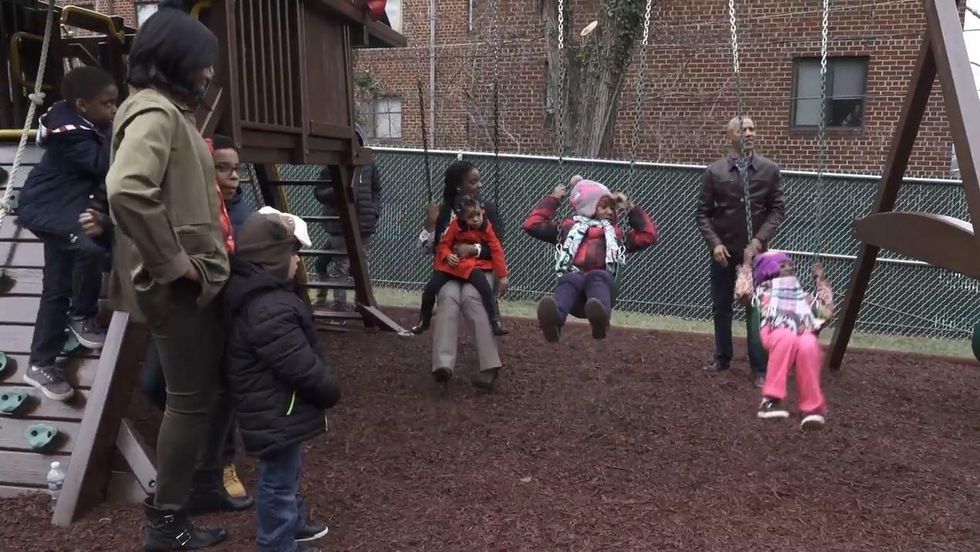 They then visited the DC homeless shelter where playset that Sasha and Malia used to play on has been donated, and helped out with painting a mural.
