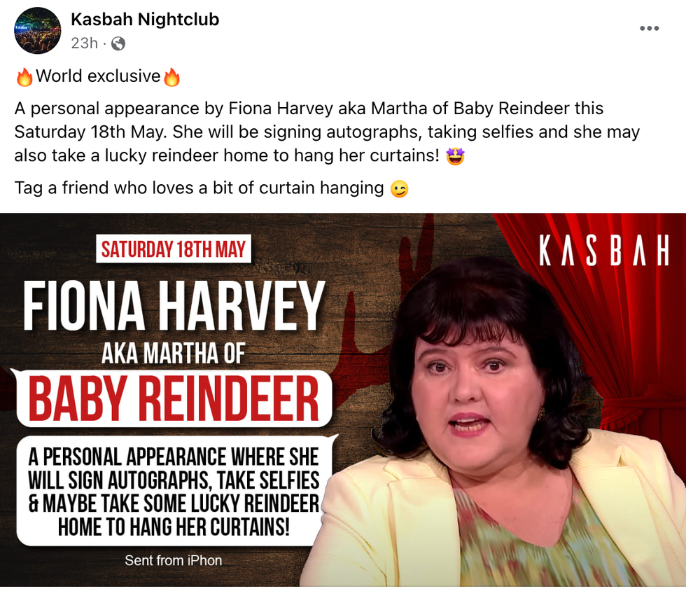 "A personal appearance by Fiona Harvey aka Martha of Baby Reindeer," the advertisement read on Facebook.