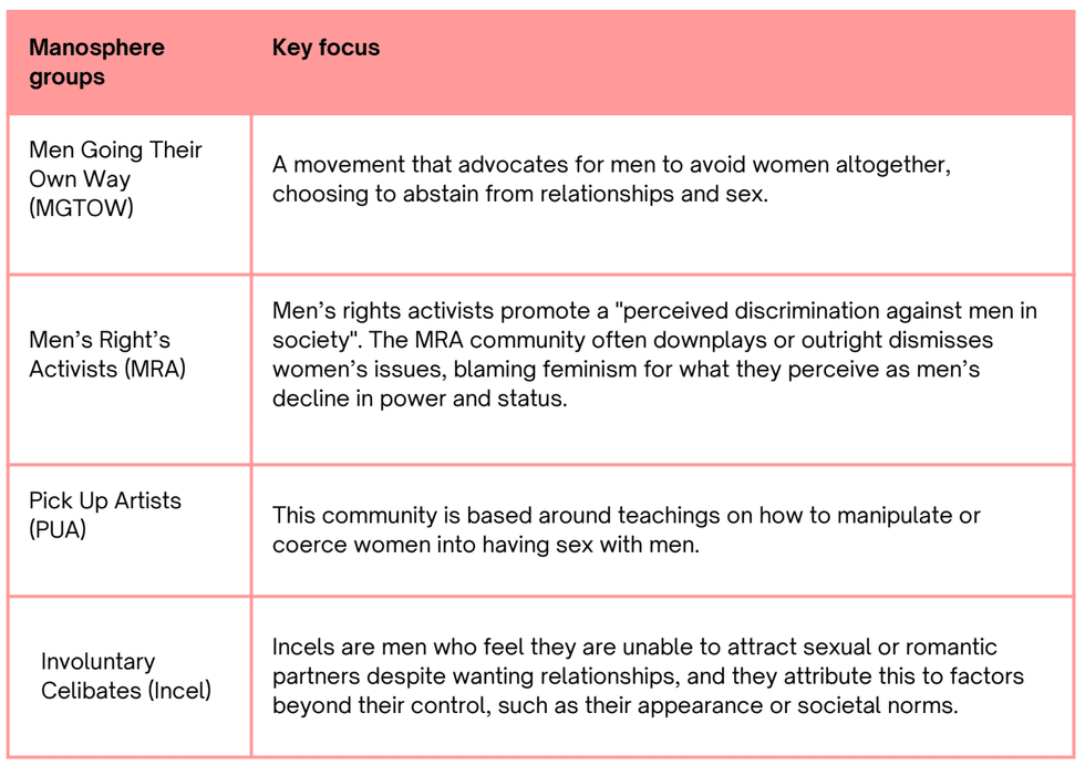 According to Educate Against Hate, individuals who are drawn to this type of content tend to fall into four predominant manosphere groups and often exhibit a poor sense of self alongside negative perceptions of others.