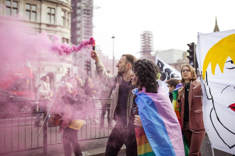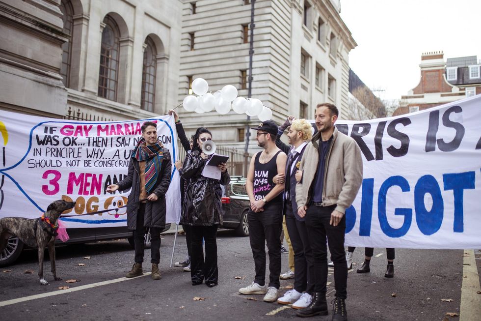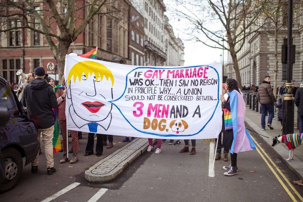 Now hundreds of LGBT+ activists have staged a "wedding" between three men and a dog outside Conservative party HQ, to protest Boris Johnson’s past comments on gay marriage.