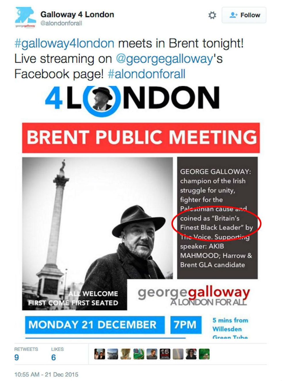 An event poster by George Galloway's London mayoral campaign has described the Respect Party politician as "Britain's Finest Black Leader".