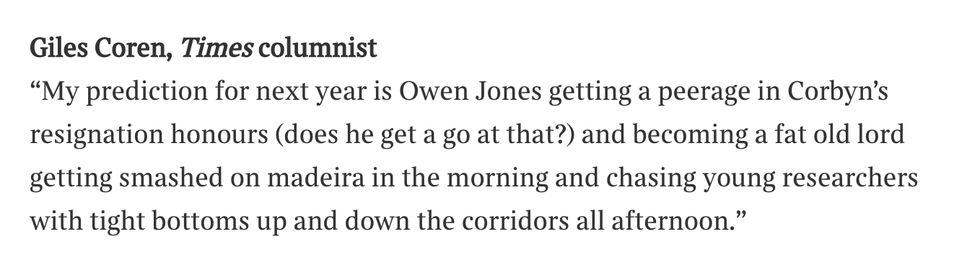 In a “prediction” for 2020, Coren wrote the following about Guardian columnist Owen Jones, who is gay: