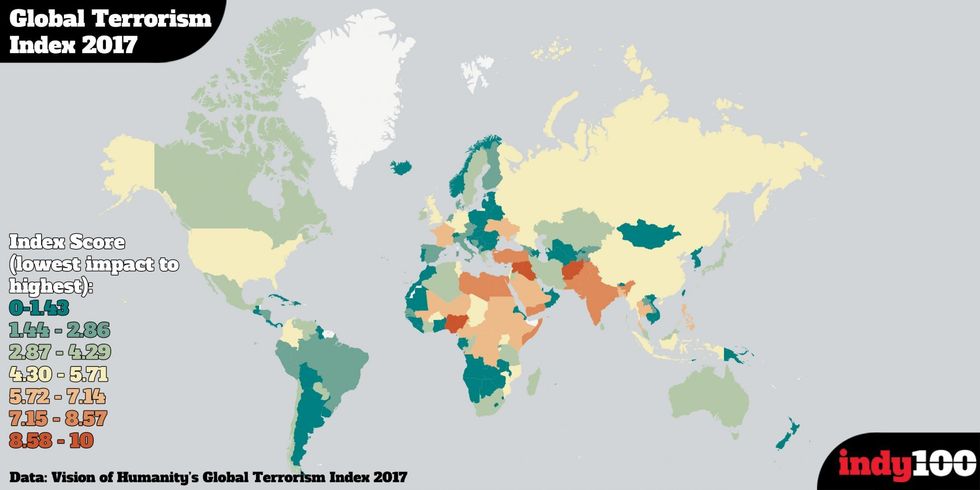 The UK ranked 35 out of the 163 countries surveyed. The Index is based on the Global Terrorism Database (GTD) and defines terrorism as follows: