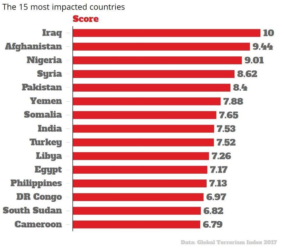 The countries impacted the most by terrorism tended to be located in African and Middle Eastern countries.