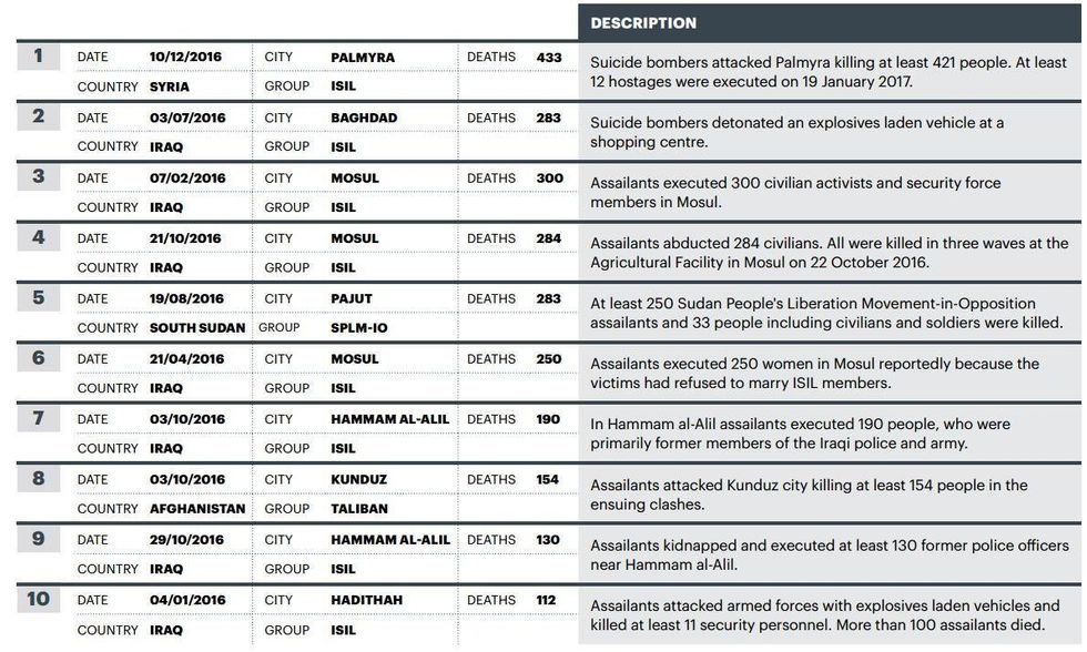 The 10 largest attacks occurred in Syria, Iraq, South Sudan and Afghanistan. Seven of the 10 occurred in Iraq