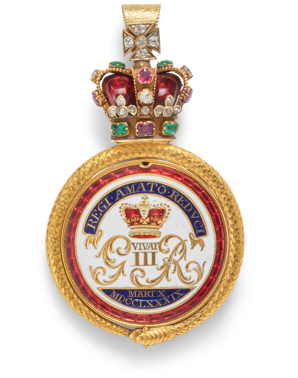 The medallion was presented by Charlotte on March 19 and it was later converted into a locket surmounted by an enamelled crown, set with diamonds, rubies and emeralds.