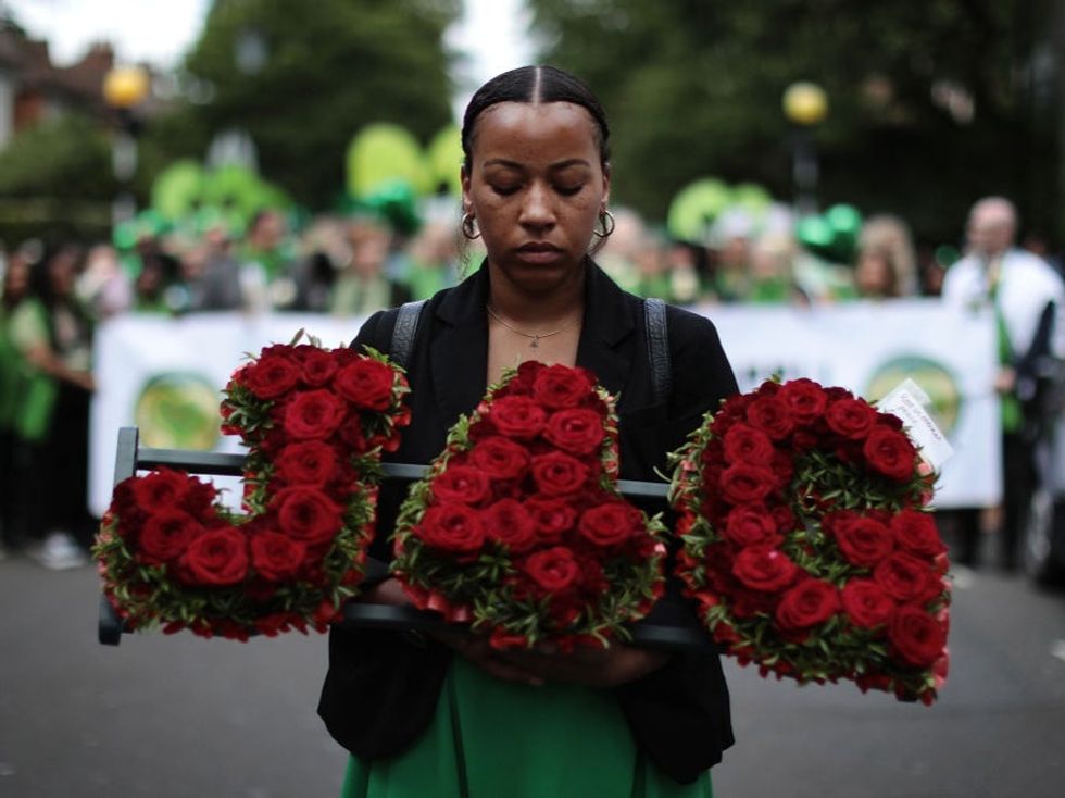 This photo, taken on the one-year anniversary of the disaster, shows a woman holding a floral offering of red roses spelling “J4G” (Justice for Grenfell) as she walks to the Wall of Truth memorial space: