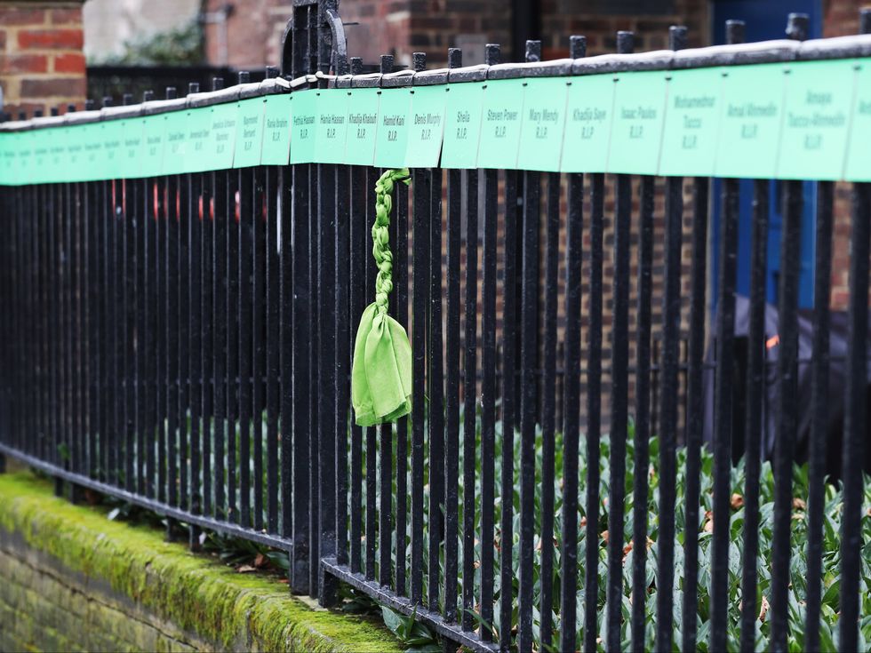 A piece of green ribbon hangs from a railing in Silchester Road, just opposite the tower, bearing placards of all of the names of the victims of the fire: