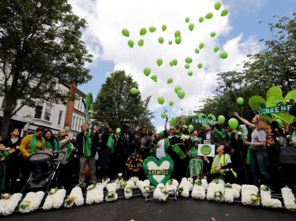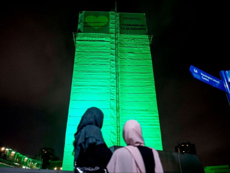 Members of the public hold a vigil and commemoration near Grenfell Tower on June 14, 2018, as landmarks across the city were lit up in green: