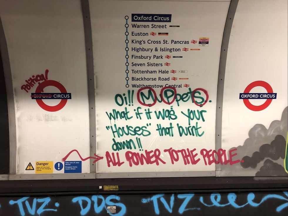 Travellers on the northbound Victoria and Bakerloo lines discovered the messages, which included the words: “Oi!! Muppets. What if it was your “houses” that burnt down!!! All Power to the people”, with the letters M P and S circled to refer to members of Parliament.