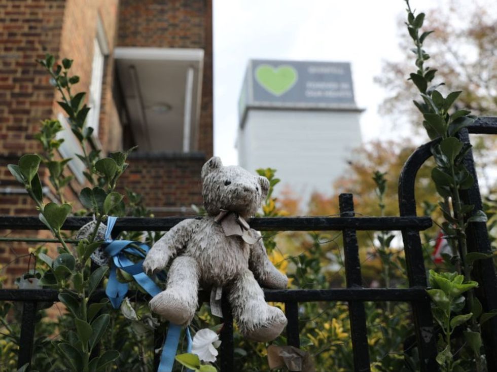 This simple memorial of a teddy bear tied to a railing with Grenfell towering in the background is a poignant, and painful, reminded that children were among the victims.