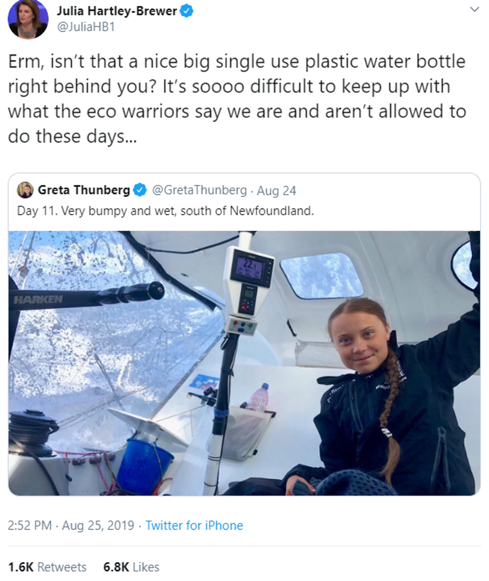 Some people remain critical of the activist. Broadcaster Julia Hartley-Brewer frequently makes fun of the teenager on Twitter recently mocking her for having a plastic bottle on the ship.