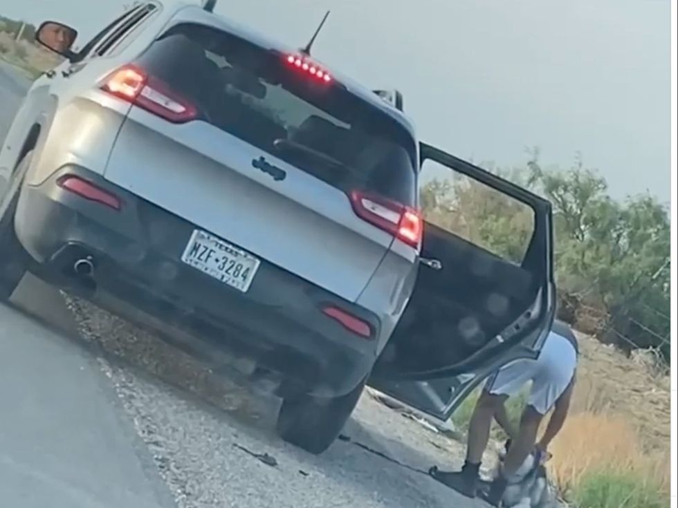 It shows a man on the side of a road in Horizon City, a suburb of El Paso, while the driver sits waiting in the SUV. He is seen removing the leash from his pooch before getting back in the car, leaving his husky behind.