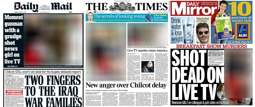 The murder of two journalists on a live television broadcast in the US was front-page news on both sides of the Atlantic on Thursday morning.
