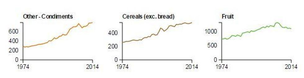 We consume far more condiments, fruit and cereals than we used to, while our consumption of bread has been dropping gradually since the 70s.