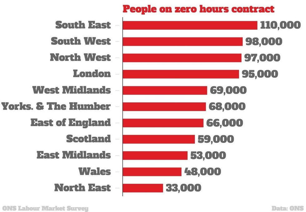 The most people for any region were found in the South East, where 110,000 people were on zero hours, but due to the greater population density of the South East, this only represents 2.5 per cent of the population.