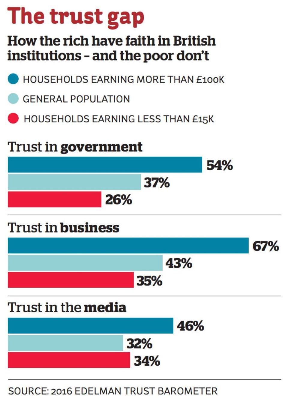 The Edelman Trust Barometer, which divides respondents into the "Informed Publics" (universityeducated, high earners with a declared interest in politics and news) and the rest, found that the disparity in trust levels between the two groups had doubled in a year.
